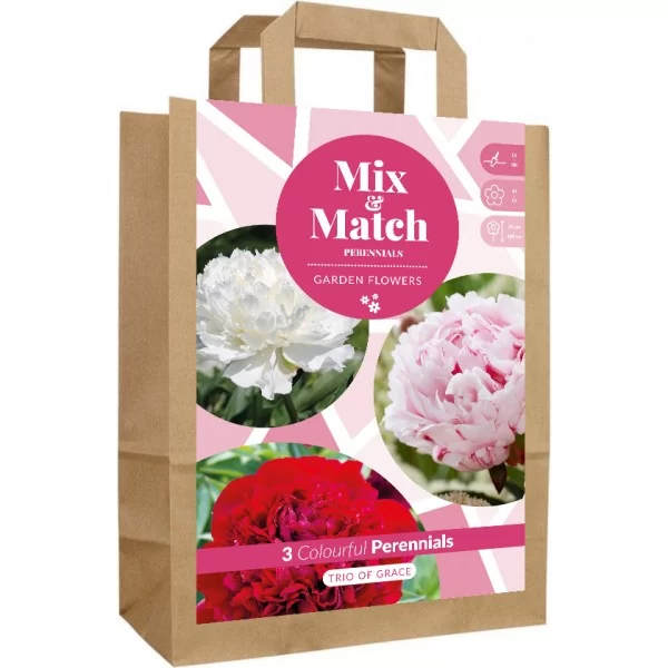 Klasikinis, prabangus bijūnų trio su baltais, rožiniais ir sodriai raudonais pilnaviduriais žiedais. Sukuria romantišką, elegantišką žydėjimą, kuris kasmet tampa vis gausesnis.