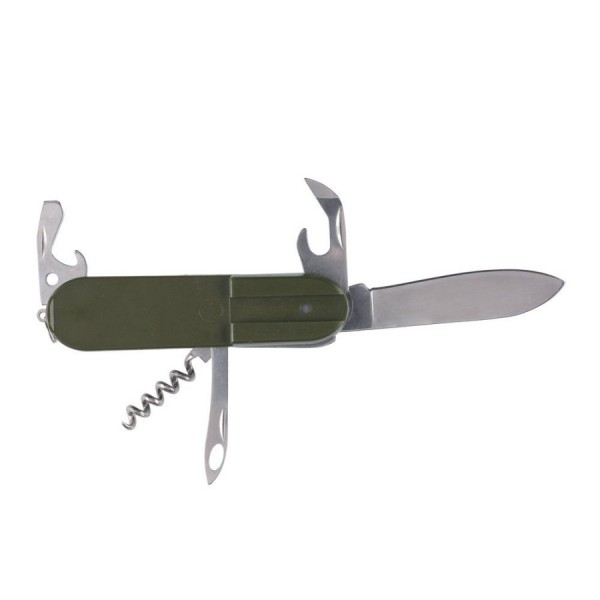 Rinkinyje yra: šakutė, šaukštas, aštrus peilis, butelių atidarytuvas, skardinių atidarytuvas, atsuktuvas, kamščiatraukis ir grąžto tipo peiliukas.