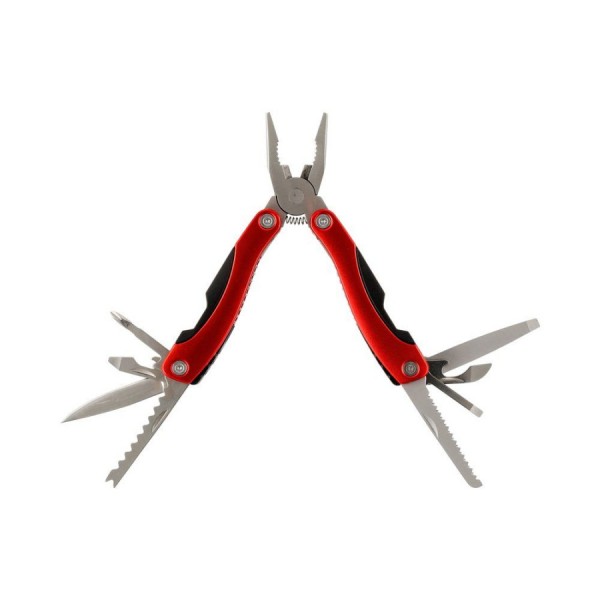 14 funkcijų viename: replės, vielos kirpimo žnyplės, pjūklas, mažas atsuktuvas, skardinių atidarytuvas, plokščias atsuktuvas, nagų dildė, kabliuko išėmiklis, žvynų skutiklis, liniuotė, kryžminis atsuktuvas, butelių atidarytuvas, mažas plokščias atsuktuvas, peilis.
