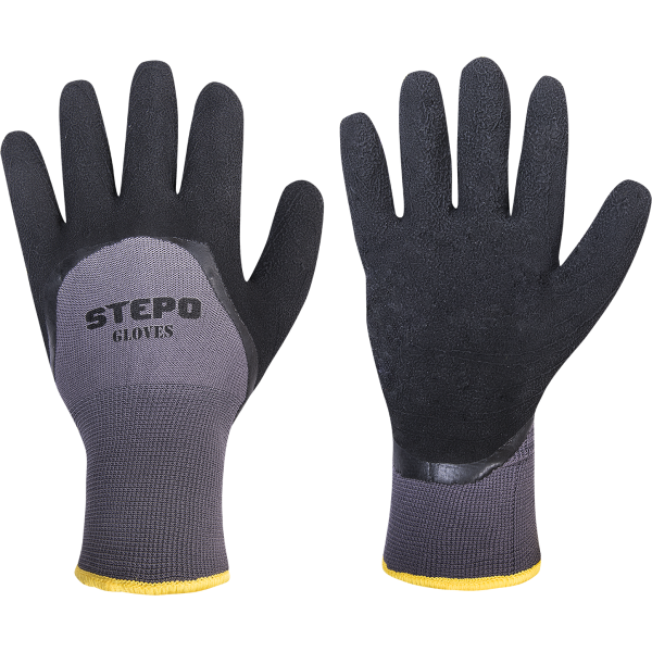 Megztos žieminės dvigubos pirštinės STEPO ICEBERG, aplietos minkštu porėto latekso sluoksniu. Puikiai tinkamos šaltomis darbo sąlygomis. Gerai sukimba tiek su sausais, tiek su šlapiais paviršiais. Storas vidinis pašiltinimo sluoksnis puikiai apsaugo nuo šalčio.